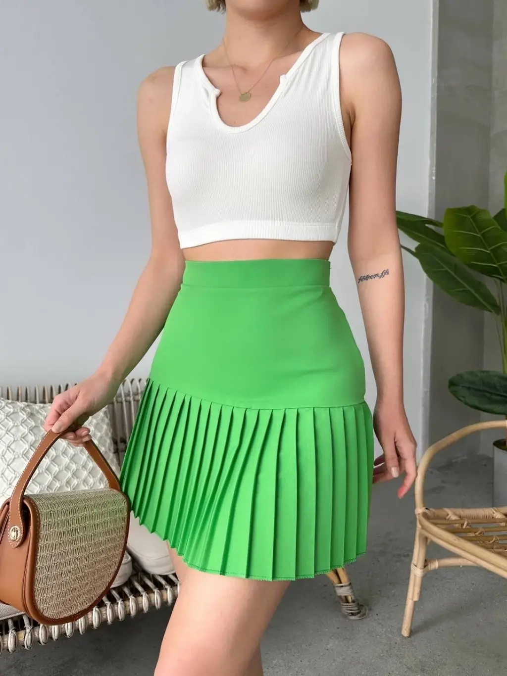 Altı pliseli mini etek yeşil s24705, şıklığı ve rahatlığı bir arada sunar.