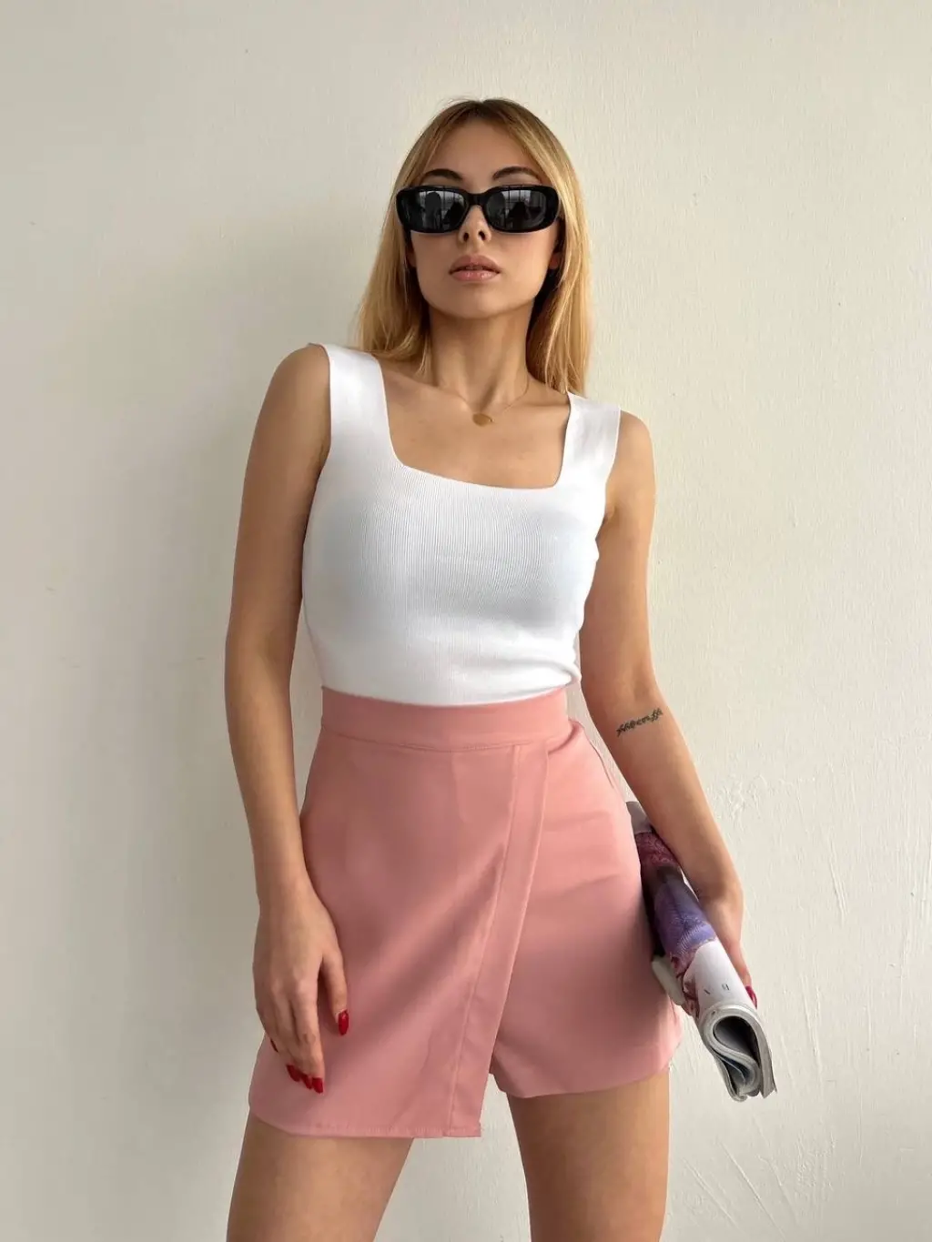 Bu harika pudra rengi şort eteği, günlük hayatta veya özel günlerde şıklıkla tercih edebilirsiniz.
